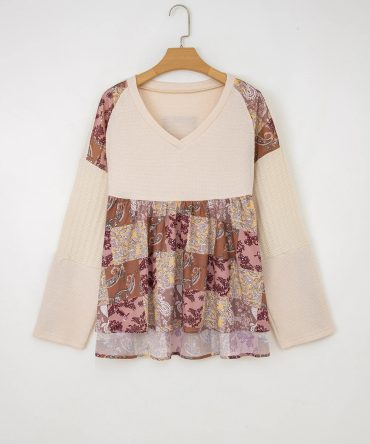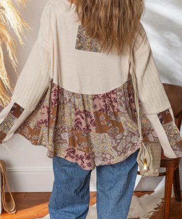Beige Paisley Ethnic Print Contrast Patchwork Long Sleeve Loose Top
