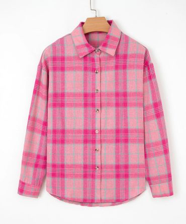 Sachet Pink Plaid Print Rounded Hem Long Sleeve Shirt with Pockets