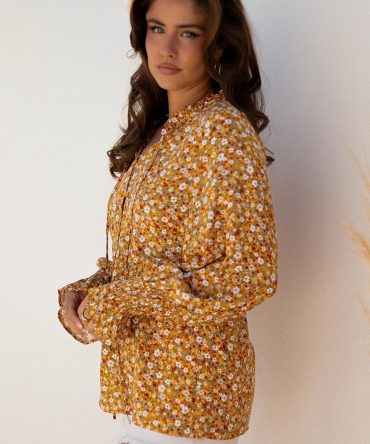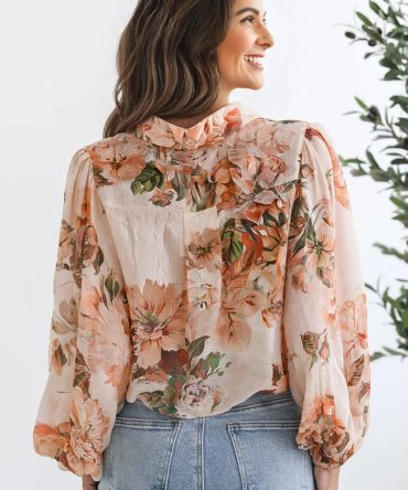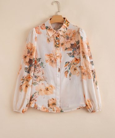 Orange Boho Floral Ruffled Bubble Sleeve V Neck Fall Blouse