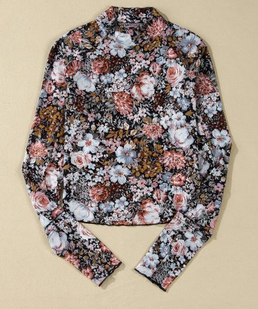 Brown Floral Long Sleeve High Neck Sheath Mesh Blouse