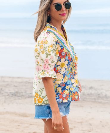 Multicolour Crochet V Neck Half Sleeve Boho Floral Blouse