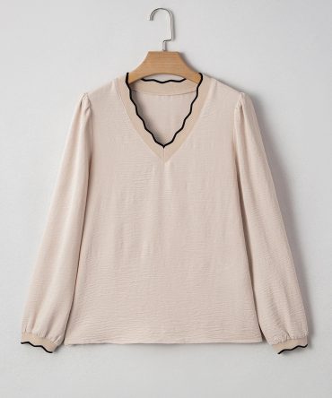 Jet Stream Contrast Scallop Trim V Neck Long Sleeve Blouse
