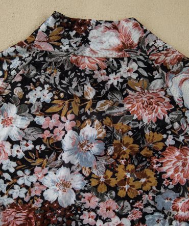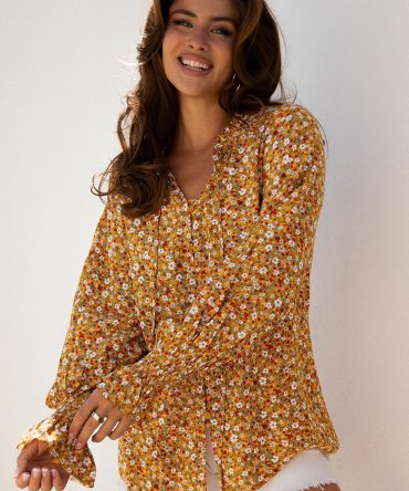 Khaki Botanical Floral Print Split Neck Long Sleeve Blouse