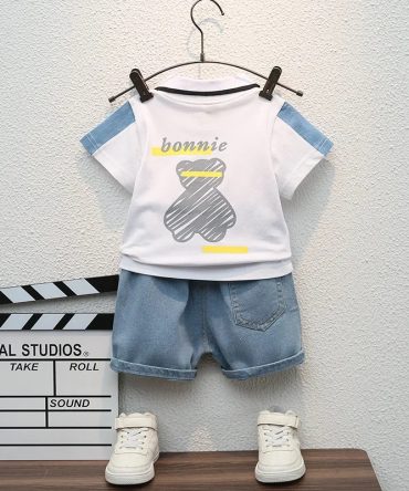 Fashion Casual Cartoon Bear Printed Lapel Short Sleeve T-Shirt Denim Shorts Two-Piece Set
