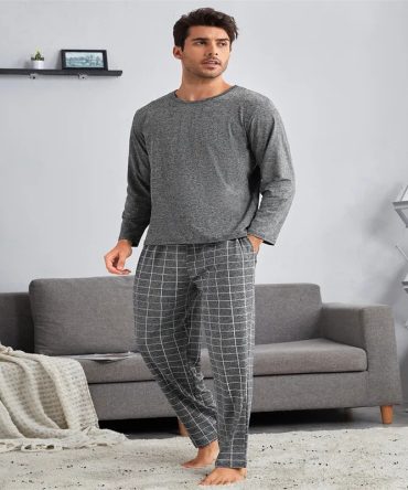 Men Casual Round Neck Long Sleeve Pajamas Plaid Trousers Suit
