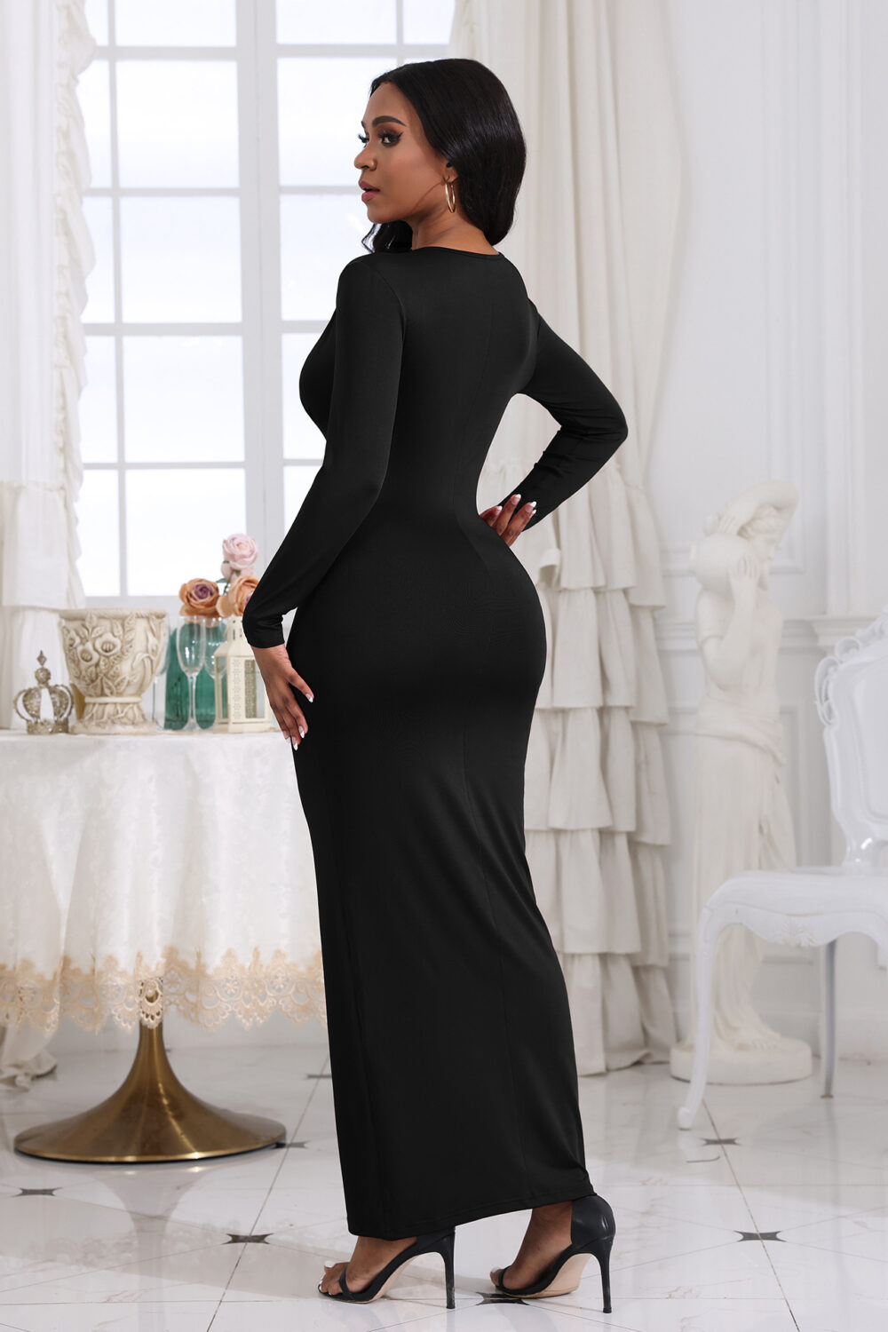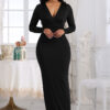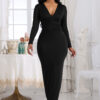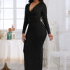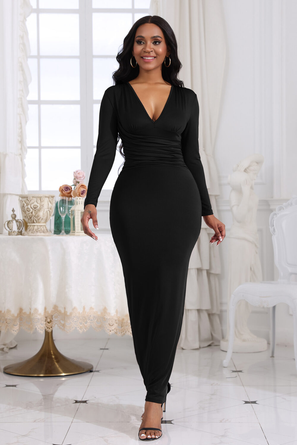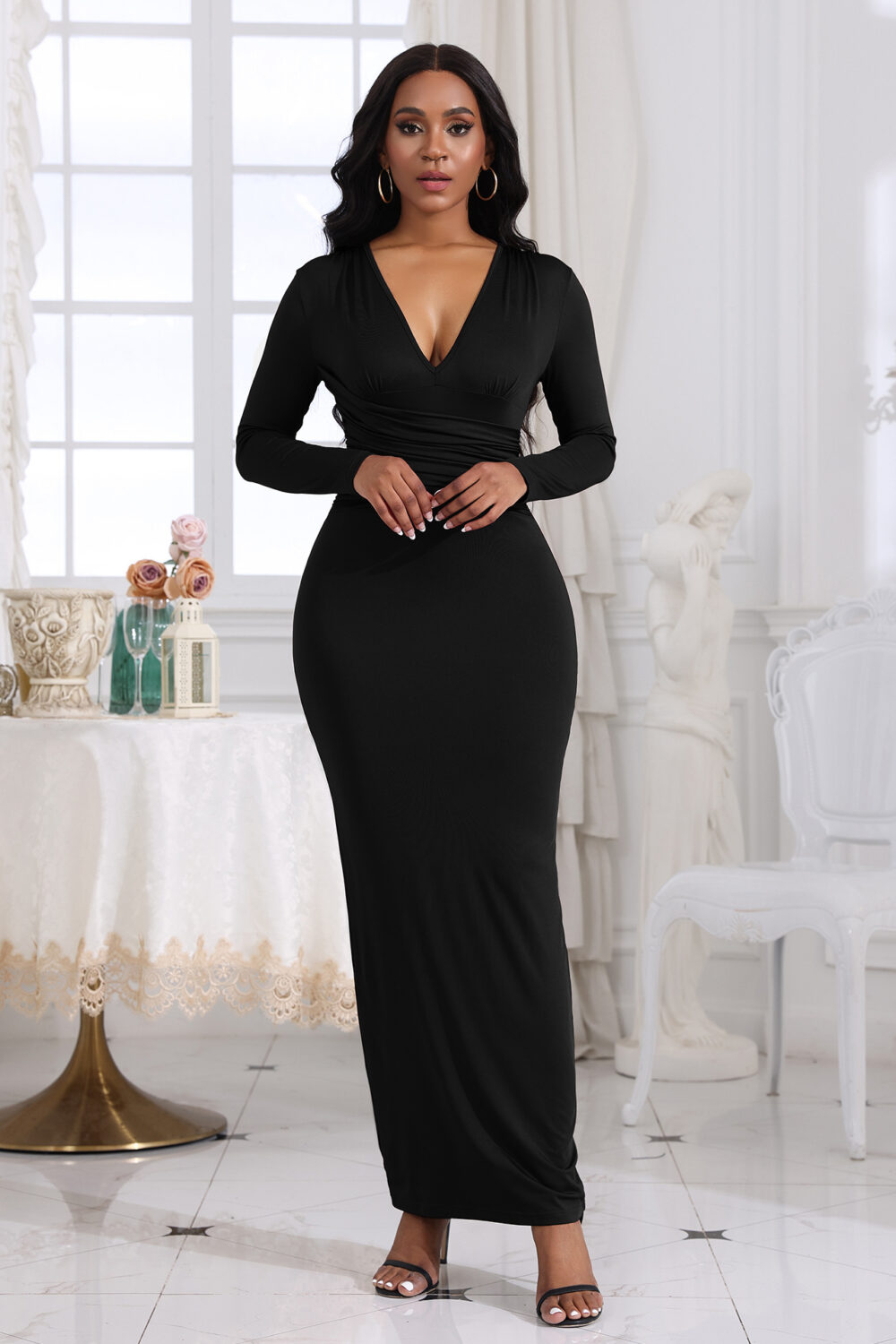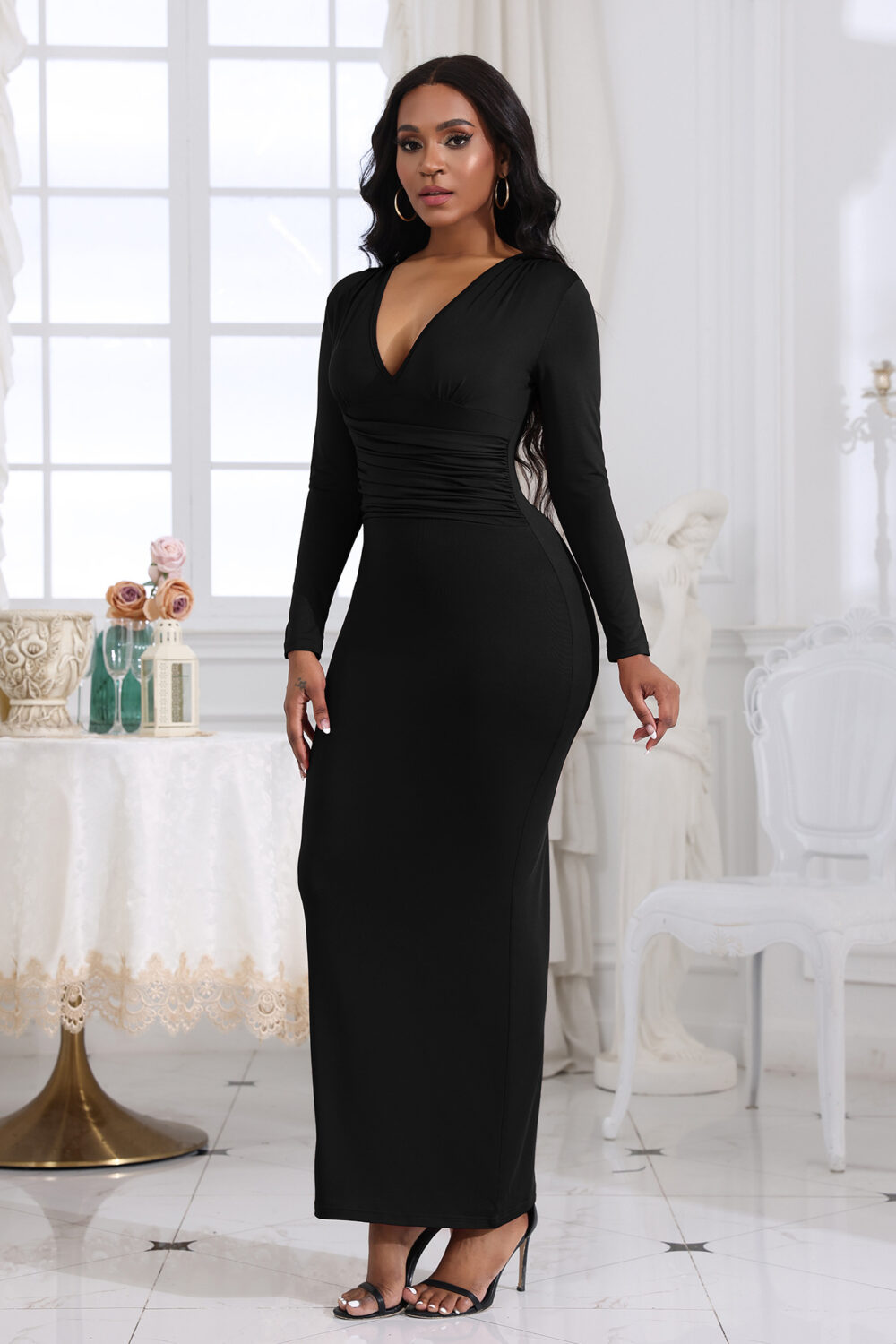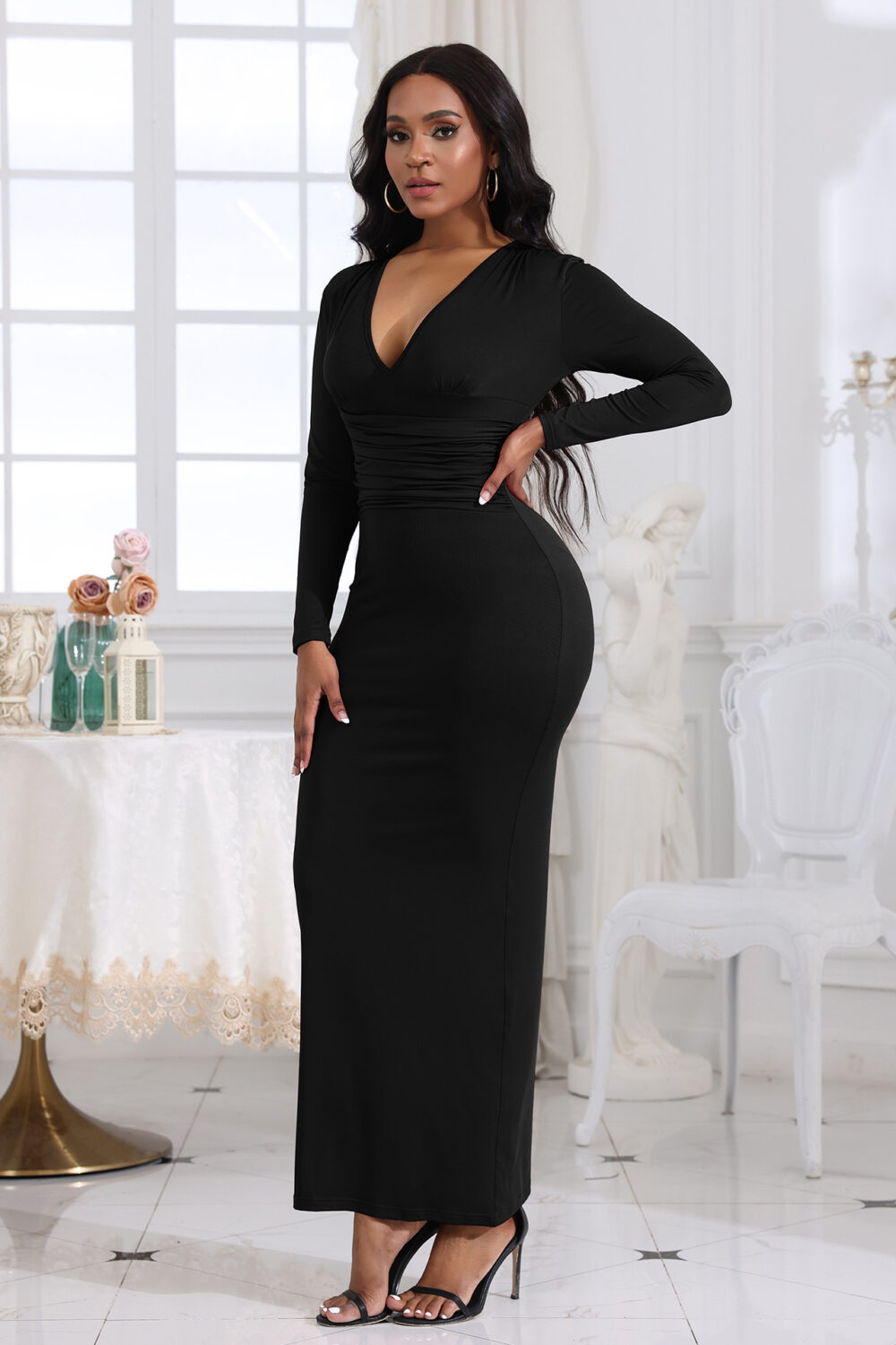 Black Fashionable sexy v-neck slim pleats solid color long sleeves dress