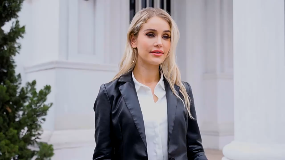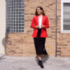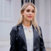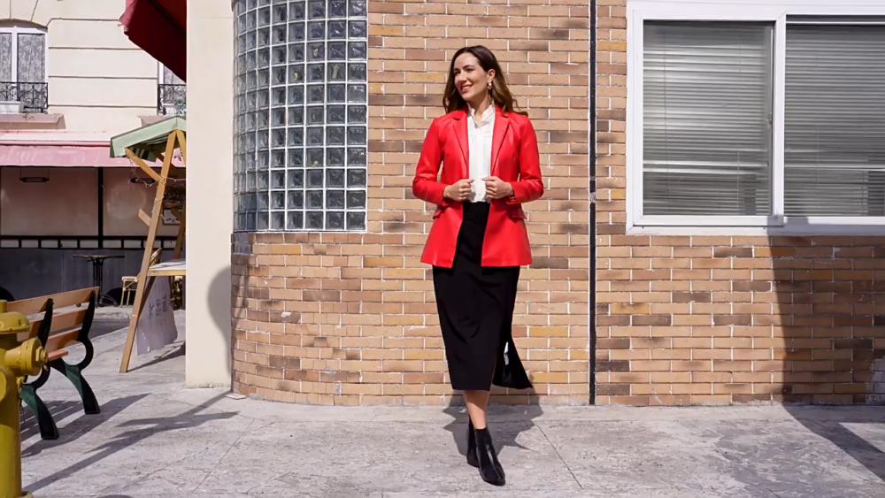 This outfit features a chic and sophisticated look perfect for both professional and casual settings. The ensemble includes a sleek black leather blazer with a single-button closure and two front pockets. giving it a modern and polished appearance. Underneath. a classic white blouse adds a touch of elegance and timeless style.